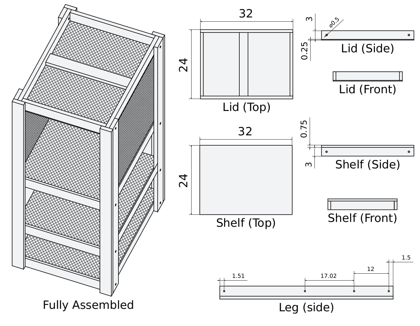 Based on Tony’s feedback, I’ve made some significant revisions. I’m going to effectively make the bottom shelf the main support for the entire shelf, with each of the four legs bolted to the shelf (and to all the other shelves; bolts since I want to be able to disassemble this for transport).