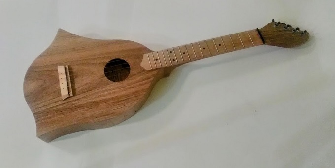 This is the latest uke I have made, most of the work done at LMN, as usual for me now. I call this type the “Aetherea.” I only build alternative ukes that do not look like miniature guitars, and this is one of my favorite types with an asymmetrical free-form body shape. Can anyone help me on the wood id for the top? This is a piece of reclaimed wood, and I’m pretty sure it is elm or ash–but which?