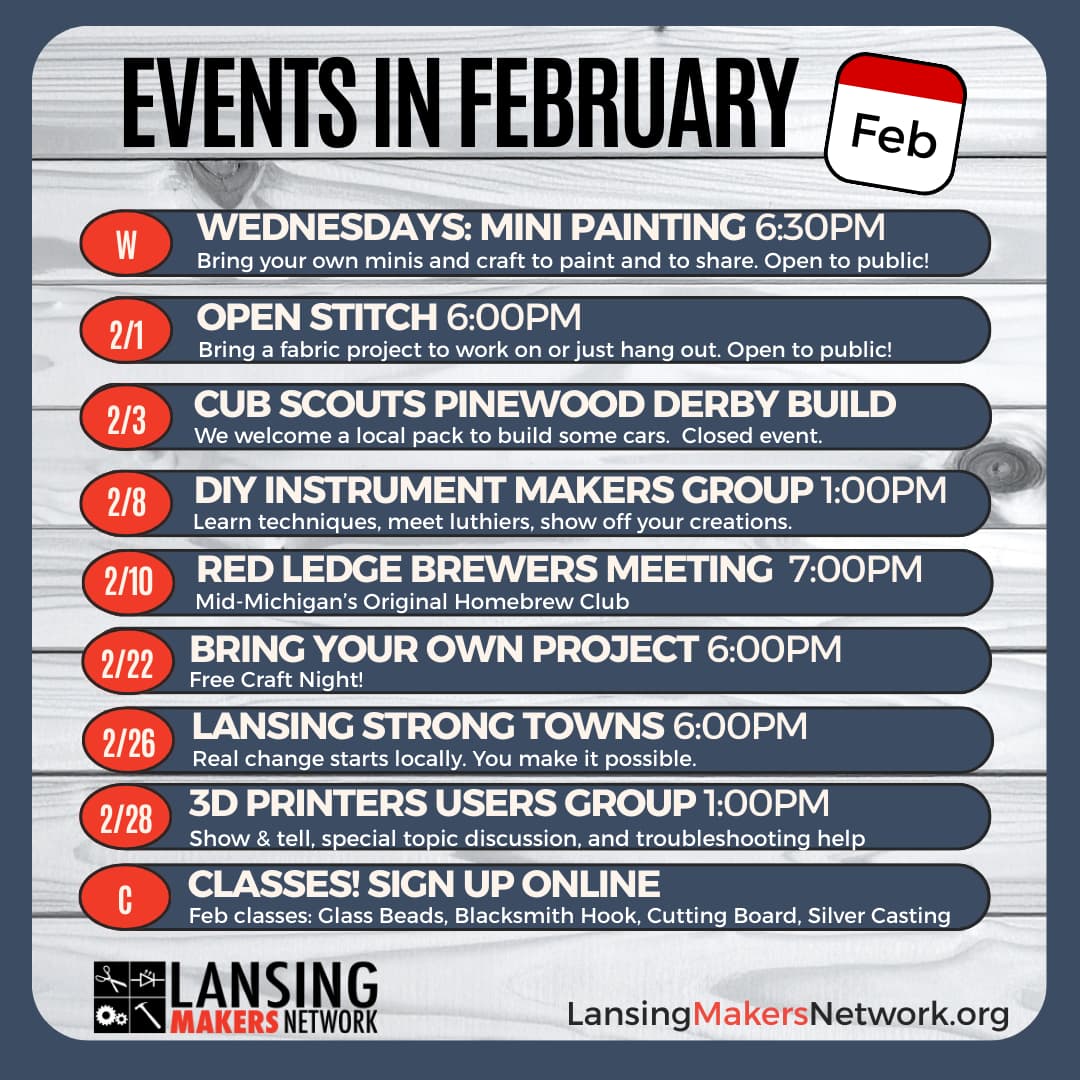We’ve got a bunch of events coming up in March. If you are interested in joining as an event volunteer, please email volunteer@lansingmakersnetwork.org