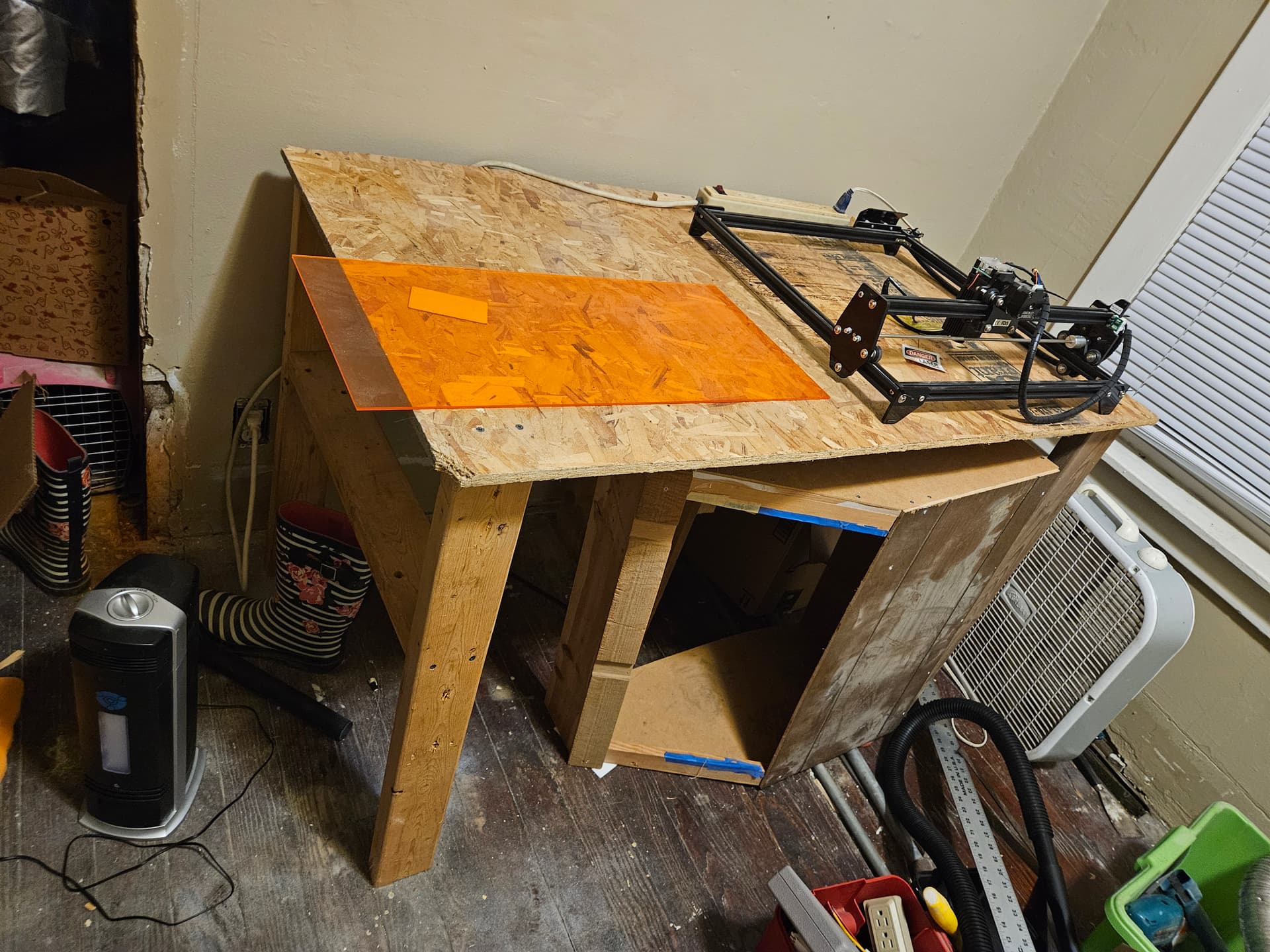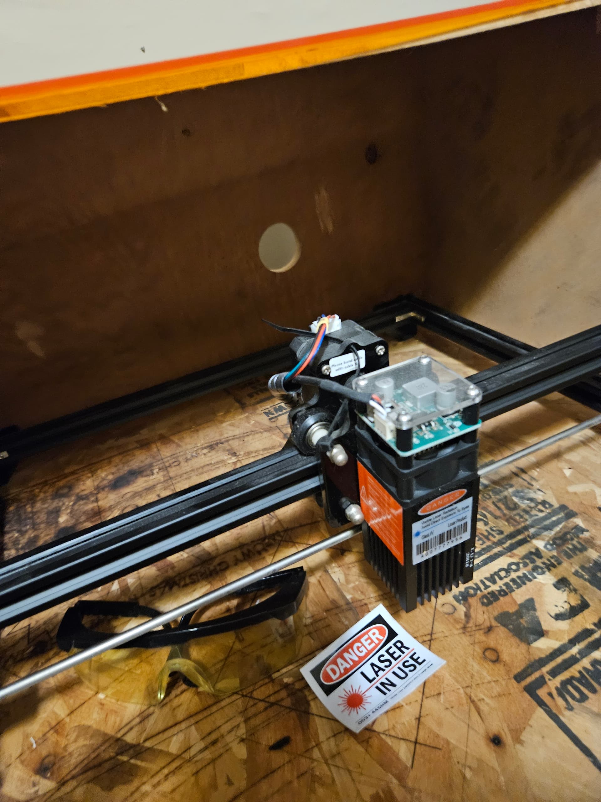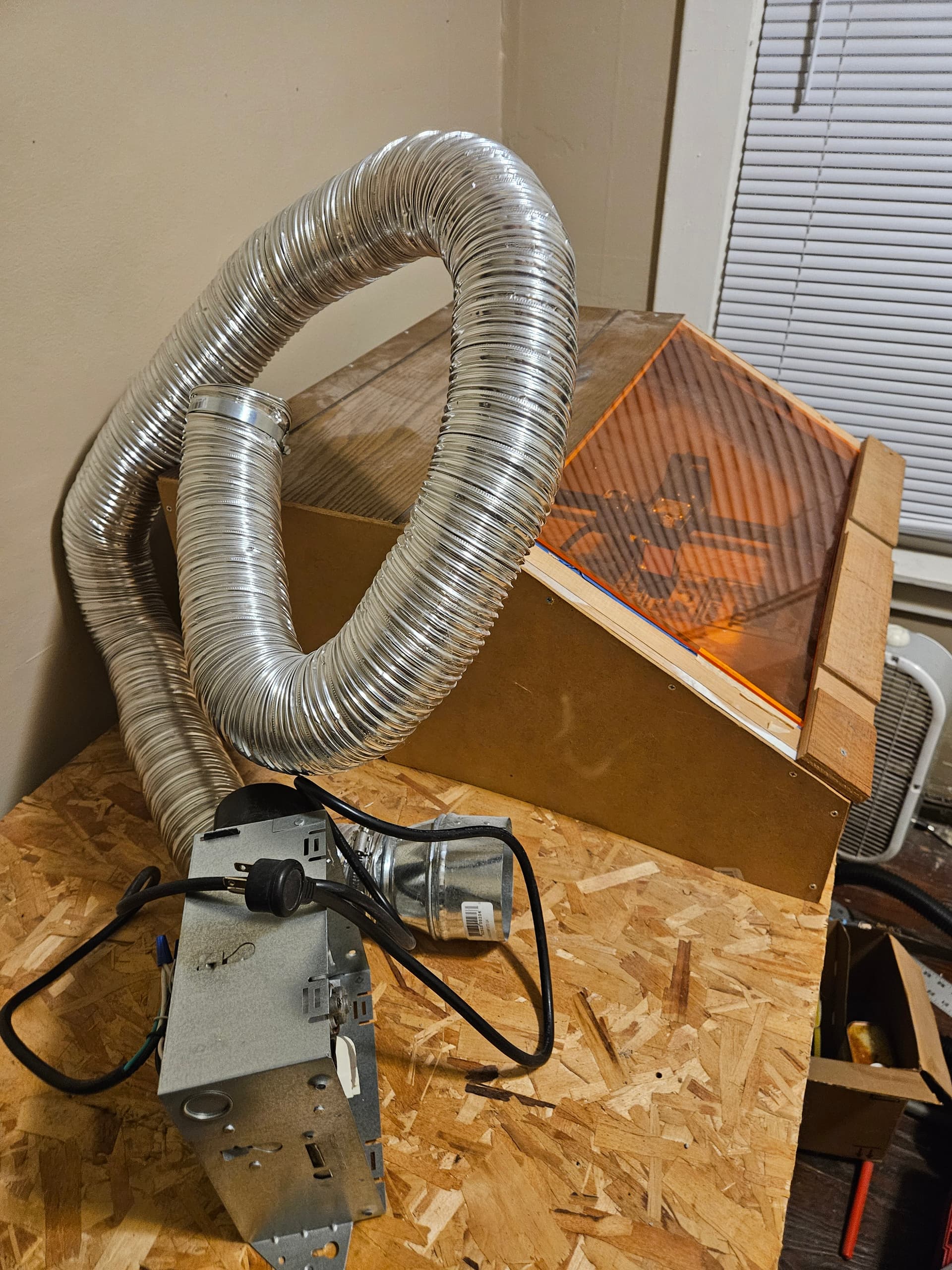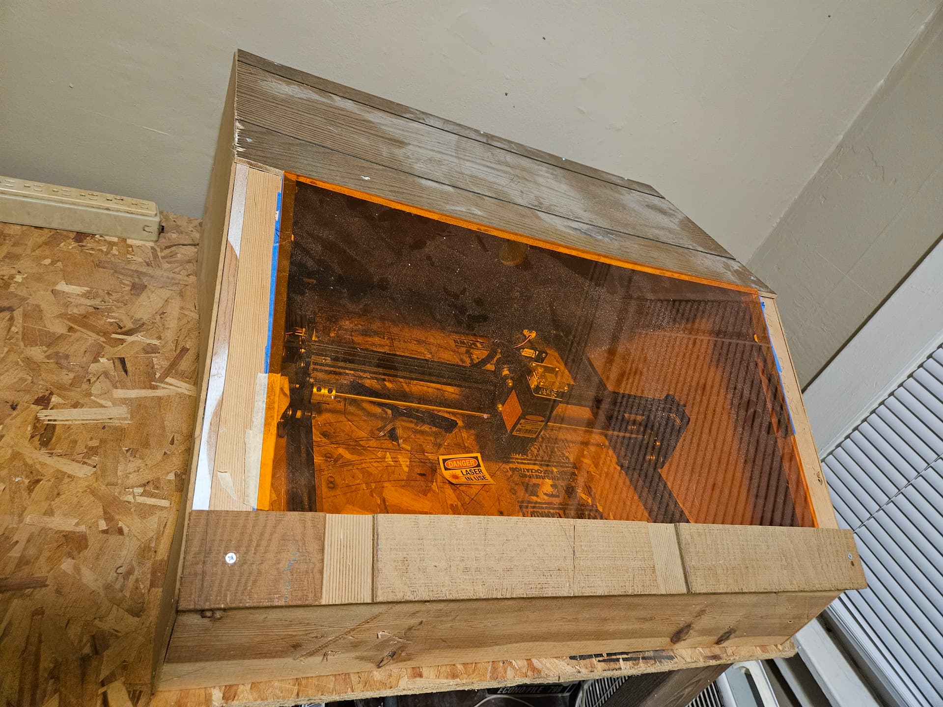 It comes with a table and housing made out of scrap wood, a bath vent fan and ducting, and a laser safe acrylic window for safer viewing