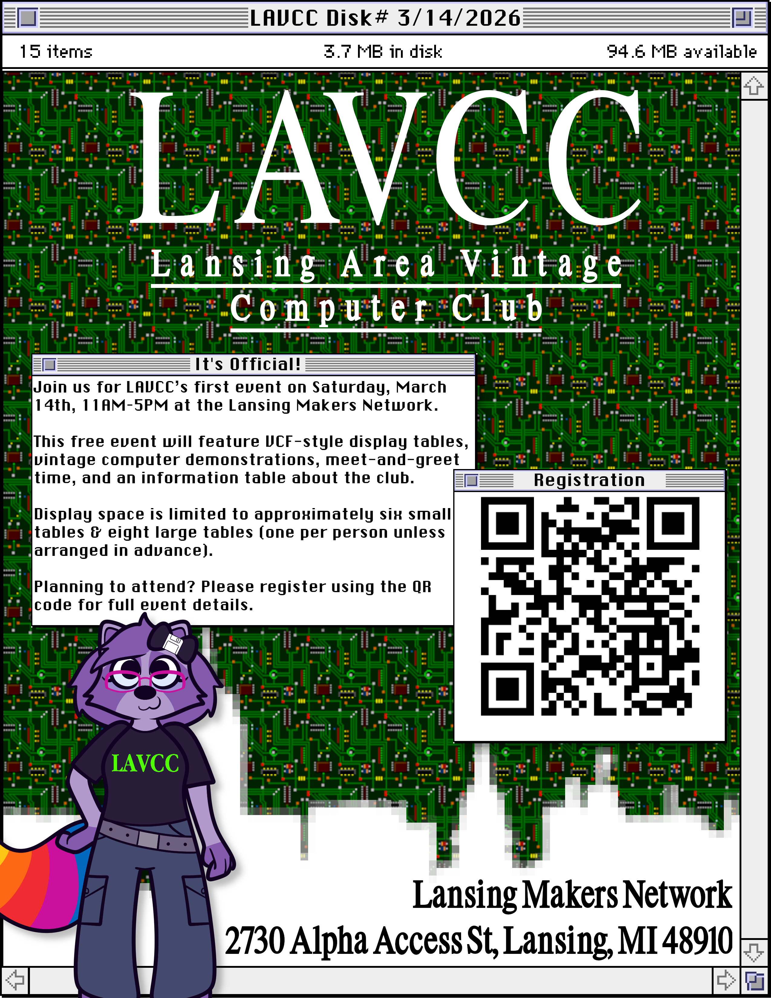 On March 14th, we are welcoming the Lansing Area Vintage Computer Club for a get together. Everyone is invited. Please register if you plan in joining.